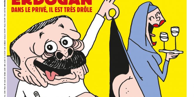 Στο νέο εξώφυλλο του γαλλικού περιοδικού, ο Τούρκος πρόεδρος εμφανίζεται με εσώρουχα, καθισμένος νωχελικά στην πολυθρόνα του, να σηκώνει το φουστάνι μιας μουσουλμάνας, η οποία θα μπορούσε να είναι και η σύζυγός του, Εμινέ Ερντογάν. Το εξώφυλλο του «Charlie Hebdo» συμπληρώνει το σκίτσο με τη φράση